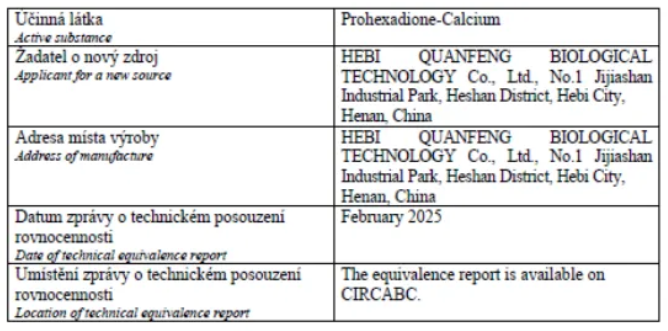 2025年2月,鹤壁全丰生物科技有限公司调环酸钙(Prohexadione-Calcium)原药获得欧盟等同认定批准。